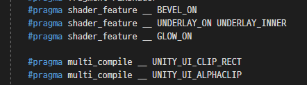 가장 좋은 해결책은 저 효과들을 사용한다고 유니티에게 인식시키고 빌드에 포함시켜 게임내에서 쉐이더를 정상적으로 컴파일을 하는 것일 것이다. 하지만 전부 에셋 번들화 되어있는 지금 딱히 방법이 떠오르지 않아 shader_feature 키워드를 전부 벗겨 강제로 빌드에 포함시키는 방법을 사용하기로 했다. 결과적으론 해결.. 하였지만 모든 텍스트에 glow효과가 컴파일될 것이고 결과적으로 성능을 저해할 것이다.