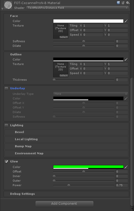 TextMeshPro에서 사용할 마테리얼과 쉐이더가 에디터 상에서는 문제없이 표시되지만 마테리얼과 쉐이더를 전부 에셋 번들화 하고 게임 중 로드 후 사용할 시 기본적으로 제공하는 TextMeshPro/Distance Field쉐이더의 Underlay, Glow 효과가 적용되지 않았다. (Lighting은 사용하지 않았지만 같은 현상이 있을 것으로 예상됨)
